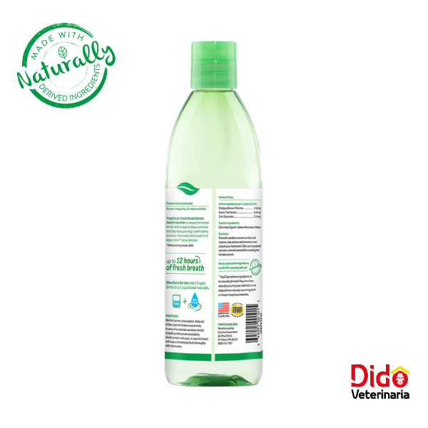 FRESH CLEAN ADITIVO AGUA PERRO es un producto ideal para cuidar la salud oral de tu mascota, para quitar el mal aliento de tu perro de una forma natural, simplemente debes agregar una cantidad apropiada de Fresh Breath en su bebedero y tu mascota beberá su agua sin problema alguno, este aditivo para mascotas cuidará su higiene oral, previniendo la halitosis, eliminando el sarro acumulado y cuidando la salud de sus encías, este producto ha sido formulado por TropiClean para proporcionar a las mascotas un apropiado cuidado bucal diariamente.